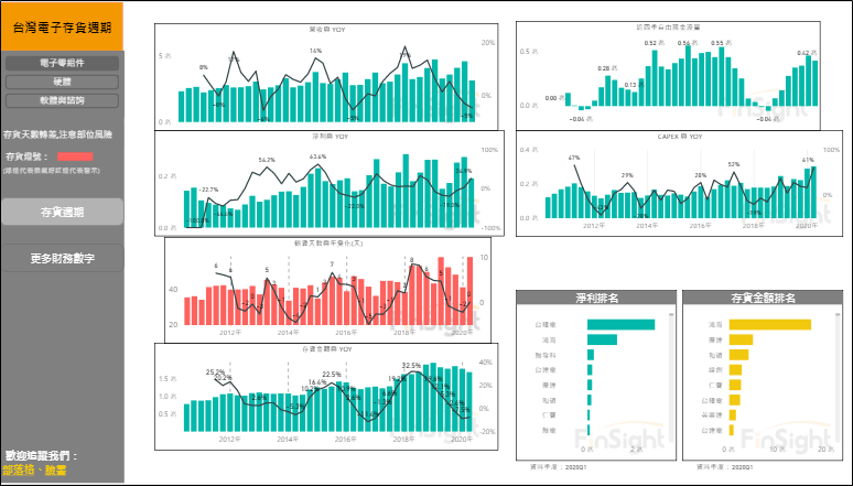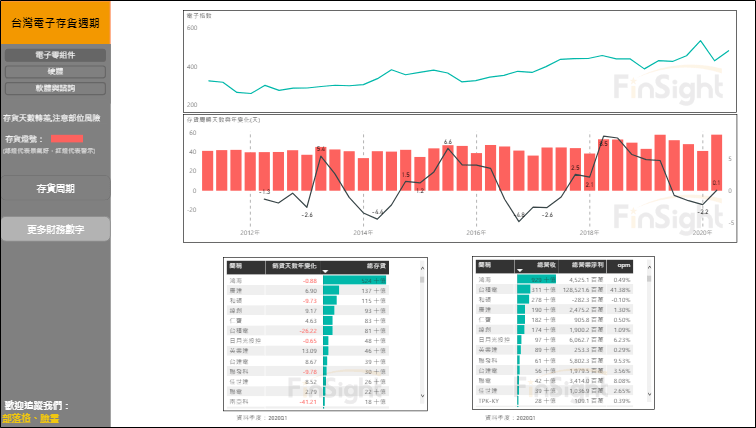 點入模板可以看到,我們將最重要的存貨周轉天數與電子指數,作為顯示的重點。2020Q1 最新一季的存貨周轉天數,相較於過去三季,已經開始拉高,但還不到警戒水準,只能說廠商庫存去化進入尾聲。
