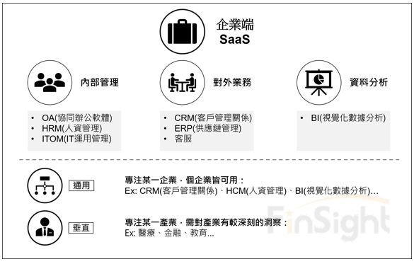- 通用型:專注某一項目,各企業皆可使用。(CRM、ERP、數據分析)