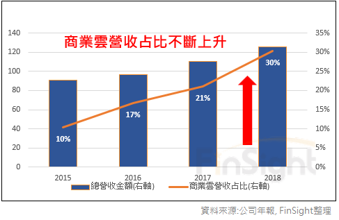 圖六、微軟的商業雲營收金額 (十億 美元) 及占比