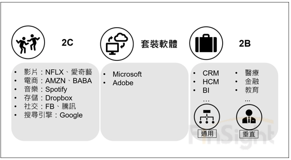 - 服務企業的 2B (to business) :依照客製化程度,可分成通用型與垂直型。