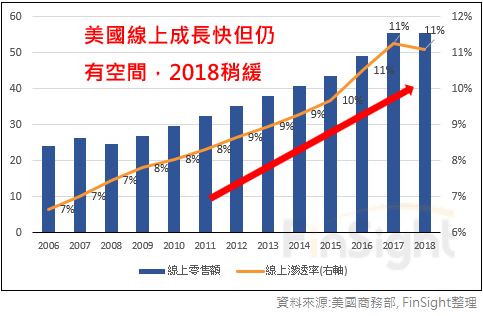 圖二、美國線上零售銷售滲透率 (十億 美元)