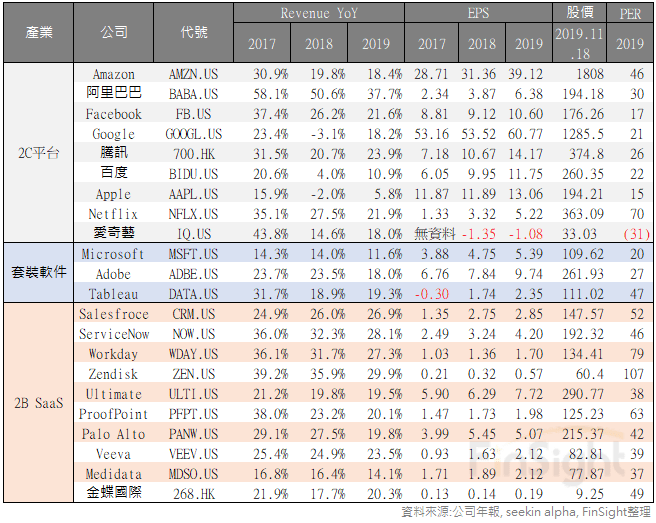 表一、市值排名前三大 2B 的 SaaS 公司營收年增率與 PE