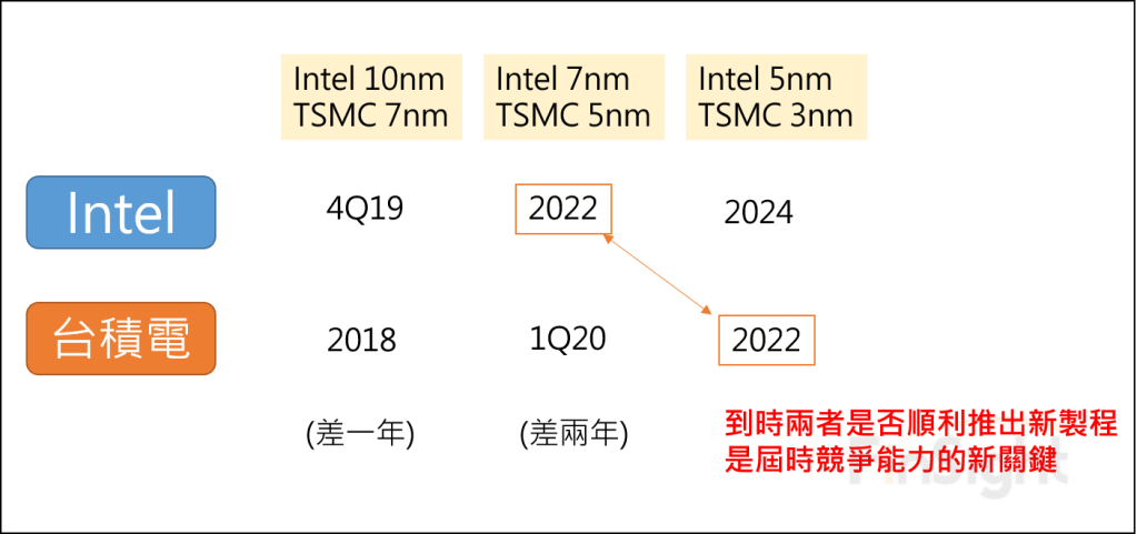 圖一、台積電與 Intel 各製程預估推出時程