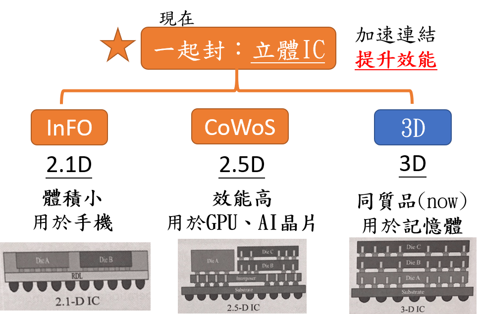 - 立體封裝:利用三維堆疊的方式,在有限的空間提高效能,甚至進一步做到異質整合將多個不同性質的元件一起封裝。