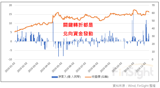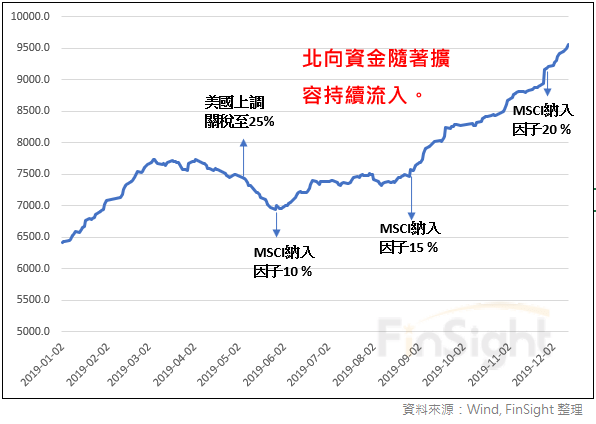 回顧今年,年初中國股市上漲時,北向資金持續流入。但隨著貿易戰升級與經濟下行壓力增加,北向資金在五月初反向流出,直到一個月後 MSCI 擴容,才止穩且開始流入。