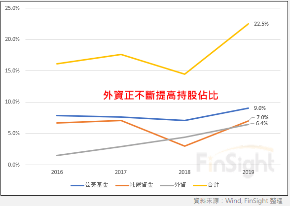 中國市場過去是散戶主導的市場。2014 年時,個人投資者占自由流通市值的比例還高達 72%;到了 2018 年底,這個數字已經降到 52%,也就是說機構投資者的持股比例已經接近一半了。其中私募基金、保險、公募基金(剔除保險、社保、年金等持股)是中國國內持股比例最高的機構。外資則透過 QFII、RQFII與陸股通等方式持續提高比例, 2019 年上半年持股比例達 6.4%,成為排名第三大機構投資者。