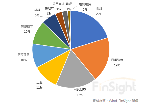 為了解外資對行業的影響力,我們計算各行業的外資持股占自由流通市值比例。日常消費與可選消費明顯偏高,都有 14%。日常消費的持股集中在白酒,可選消費則聚焦在電器。醫療的持股也占了快一成。