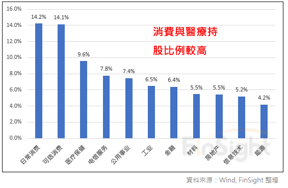 外資在中國股市持股的市值絕對金額中,金融占了 20%。由於金融市值占 A 股的比例約 25%,因此這部分多是被動型基金的配置。再來可以看到日常消費與必須消費分別占了 19% 與 17%,相較其自由流通市值占比分別是 11% 與 10%,明顯超配。醫療保健的占比為 10%,相較自由流通市值占比 8.4% 也有超配。
