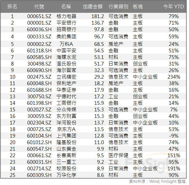 若以個股來看,今年買最多的是「格力電器」,而國有銀行普遍都有資金流入。另外日常消費雖然是資金淨流出,但有三檔股票是淨買入的,其中豬肉概念股「溫氏股份」、「牧原股份」也被北向資金所青睞 ,是因為今年非洲豬瘟導致豬價大幅上漲,且行業汰弱留強。