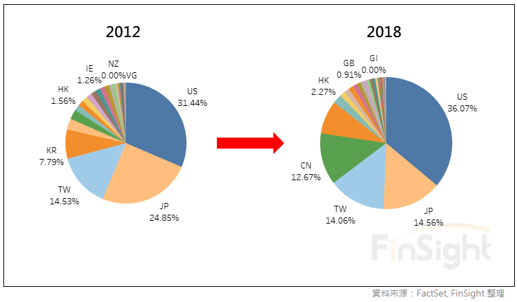 圖一、2012 年與 2018 年各國科技類公司營收占比