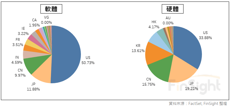 軟體的公司,一半以上營收集中在美國,包括像是微軟、臉書、Google 這些大公司,目前已經滲透到全世界。而中國則藉由廣大的網路使用民眾與網路封鎖政策,發展中國特色的互聯網軟體公司,比例上也持續提升。