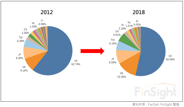 韓國獲利佔據第二名,且佔比增加最多。以 2018 年的資料來看,三星與海力士兩家就佔了獲利的 90%,獲利結構相當集中。