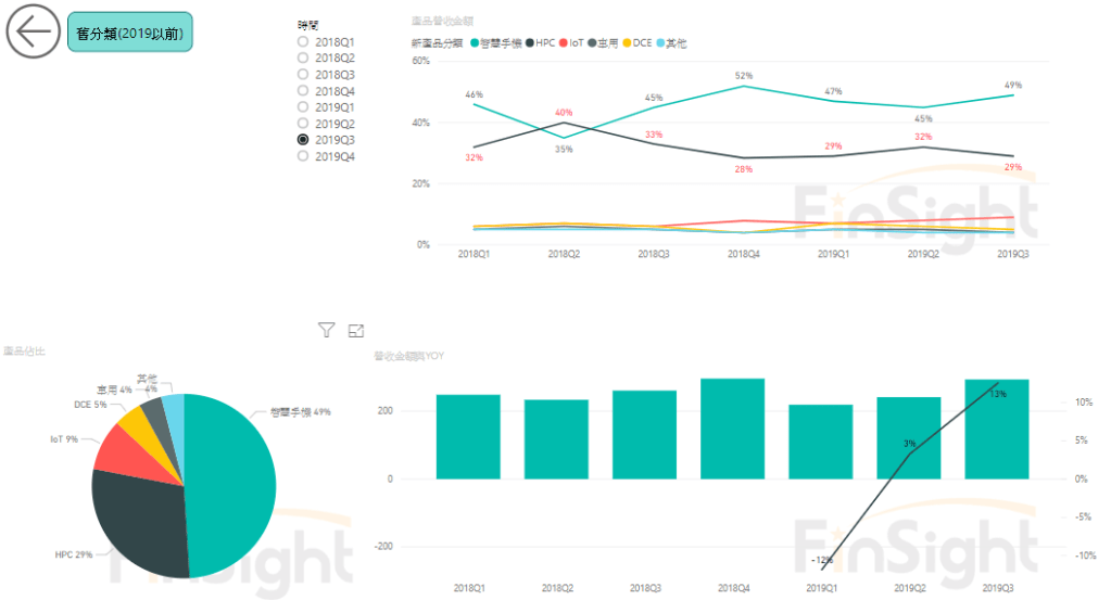 產品分類在 2019 年有重新定義,2019Q3 智慧手機是主要的營收來源,HPC 的比重也有三成。若想看舊的分類比重,也可以點選「舊分類 (2019以前)」按鈕查看。