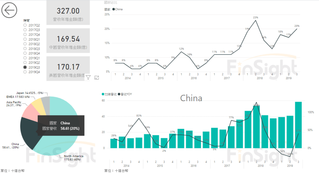 右上是各地區的占比變化,FinSight 將比較重要的美國與中國的資料標籤顯示出來給大家看。右下是營收金額與年增率的變化。