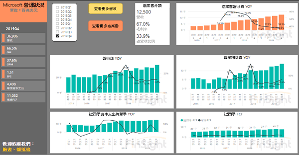 FinSight 也釋出微軟的視覺化模板,可以看到營收項目的變化。也另外做了商業雲的頁面,對商業雲的掌握更加輕鬆。(連結點這裡)