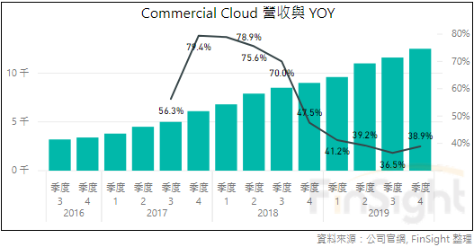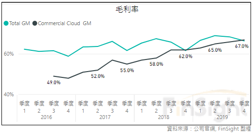 這幾年,微軟在商業雲不斷擴大戰果,2019 年商業雲的占比接近三成、營收年成長 38.8%,相比全部營收才年成長 13.4%,商業雲是微軟主要的成長動能。也因為布局的早,隨著折舊的攤提與營收的成長,商業毛利率不斷提高已經超越整體毛利率來到 67%。