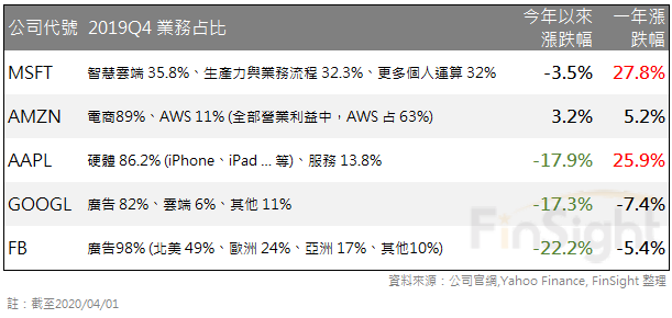 將微軟的股價表現與其他大型尖牙股相比,微軟股價也反映他在雲端業務上的地位。過去一年,微軟的漲幅高達 27.8%,略高於去年 iPhoen 11 熱賣的蘋果;今年以來,微軟的股價表現也只小跌 3.5%,僅輸給一樣受惠短期遠端工作的雲端公司亞馬遜的 3.5%;而受害於景氣不好的廣告業務 (FB、GOOGLE)、消費型電子產品 (APPLE),年初以來的跌幅都明顯較大。