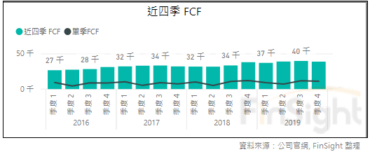 照目前疫情的發展,我們很有可能會看到,短期有越來越多的失業人數與公司倒閉。這時候資產負債表越健康,越容易度過這次的經濟休克期,並在下次復甦時取得更多的商業地位。微軟帳上約當現金與短期投資目前有 1342 億美元,總負債1726 億美元,負債比例並不高。再加上自由現金流量非常穩定 (成功的訂閱制特色!),近四季 FCF 有 390 億。手握大筆的現金,並擁有不錯的現金流量。