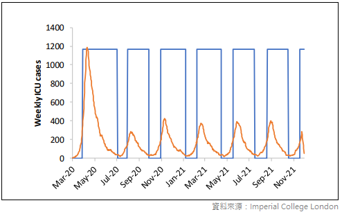 圖一、依據 ICU 數量採取管制與解封的策略