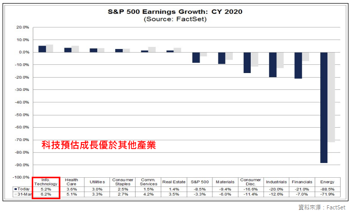 圖三、FactSet 統計分析師預估 2020年 S&P 500 獲利年成長