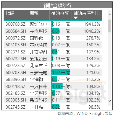 圖三、中國 A 股科技股中「半導體與半導體設備」的淨利、政府補貼金額、補貼佔淨利比重