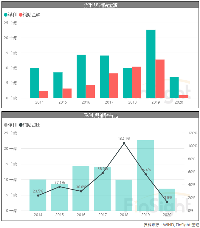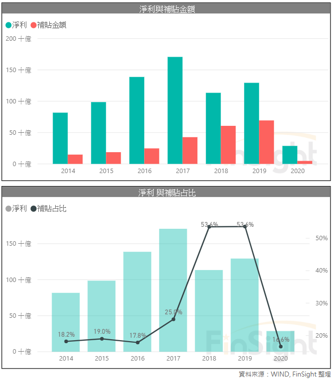 以中國 A 股掛牌中的科技股作為樣本,計算補貼與淨利的金額。可以發現近幾年,中國政府對於科技的補貼是逐年增加,2019 年已到 694 億人民幣,佔整體科技淨利的 53.6%。