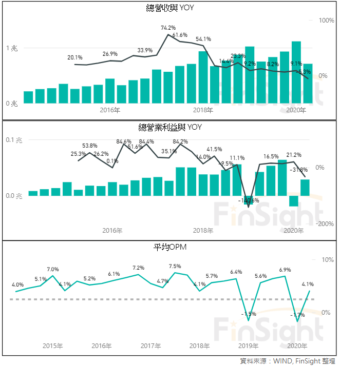圖二、中國 A 股「信息技術」的營收與 YoY、營業利益與 YoY、營業利益率 (OPM)