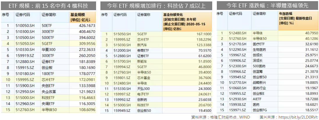 以截至 5/15 中國發行的 ETF 來看,5G ETF 已經成為中國第四大 ETF,規模 309 億元。而且今年 ETF 規模增加的排行榜上,科技相關的 ETF 占了七成以上,足以顯見科技這個主題受資金青睞的程度。
