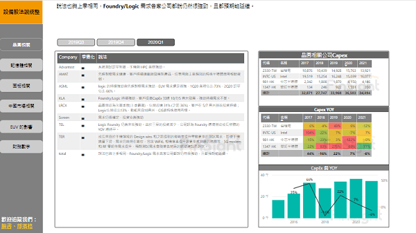 EUV 部分則是除了 ASML 提到 EUV 在 Logic/Memory 需求都很好之外,其他廠商都沒有談到 EUV 相關問題,本次法說的核心問題還是圍繞疫情的發展與影響。