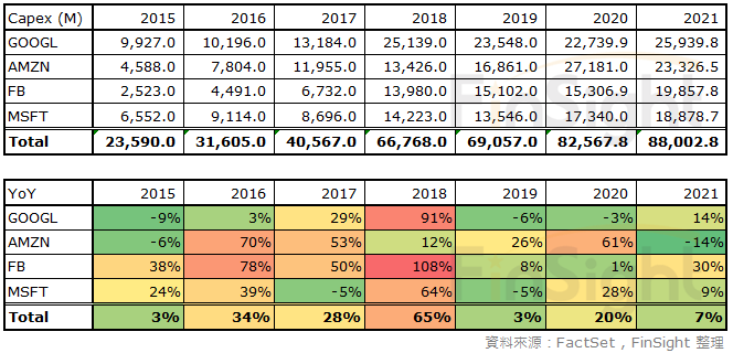 表一、美國雲端公司資本支出 (百萬美金) 與 YoY