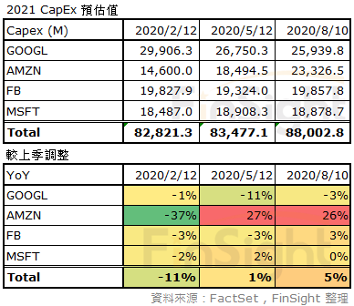 - 本季 (2Q20):廠商說法比上一季好很多,預估 2020 年資本支出回升 5%,幾乎回到了疫情前的水準。而且大多數公司都強調,隨著雲端應用頻率增加,將隨著營收成長持續擴大資料中心的資本支出,目前預估到 2021 年這四家公司的資本支出仍將成長 7%。