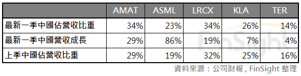 表一、半導體設備廠商中,中國佔營收比重與中國業務成長性