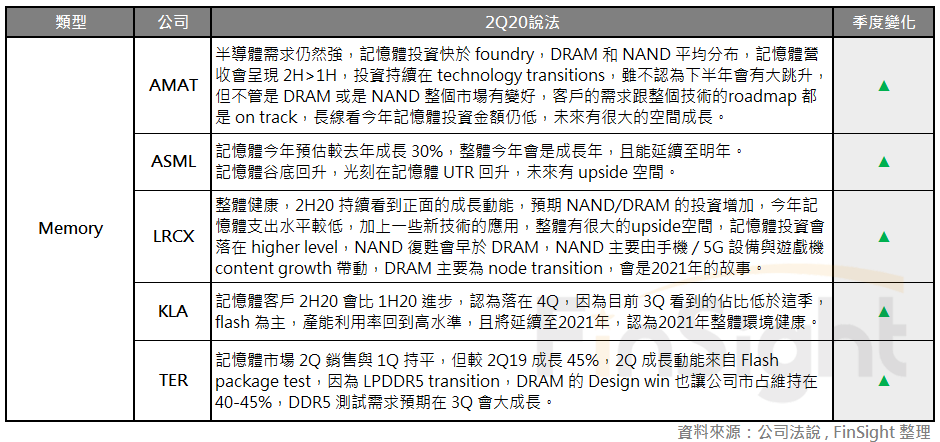 記憶體部分,說法皆較上季樂觀,認為持續谷底回升,且目前市場健康,2H20表現會優於1H20,並會延續至2021年。
