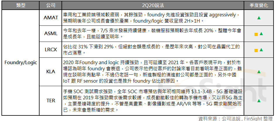 另外,AMAT / ASML / LRCX 都有提到今年記憶體的投資相較過去仍屬於低位水準,因此認為未來還有向上調升的空間,LRCX 也維持先前看法認為 NAND 的復甦會早於 DRAM,DRAM 將會是2021年的故事;後端測試商 TER 則表示,DDR5 測試需求預期在第三季會有顯著成長。