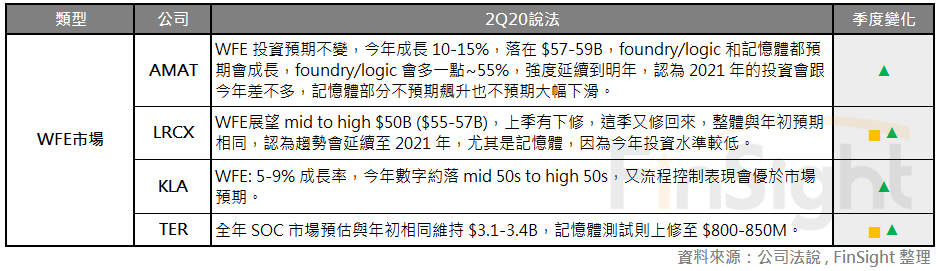 針對 WFE (Wafer Fab Equipment) 市場看法,設備商們這季的看法多上修至年初疫情前的水準,落在 $57-59B;後端測試商 TER 則維持全年 SoC 測試市場 $3.1-3.4B 的預估,上修記憶體測試的市場預估至 $800-850M。
