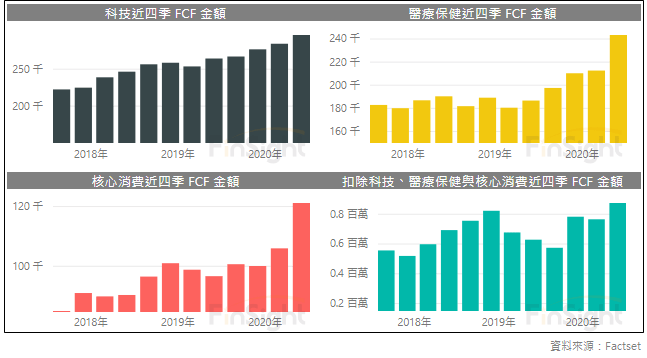 圖三、S&P 500 科技、醫療保健、核心消費各自的 FCF
