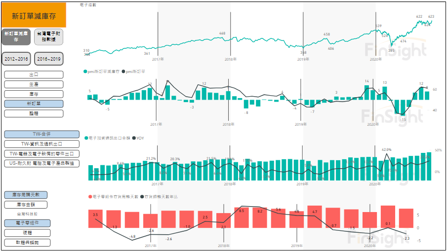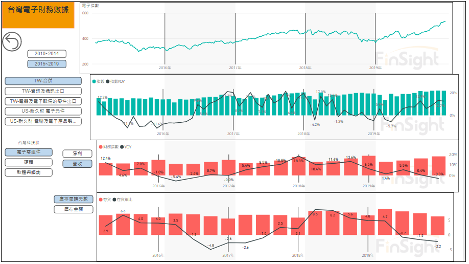 根據 FinSight 的觀察,出口指標以台灣資通訊與台灣電子零組件合併使用較為有效,當合併的出口 YoY 大於 0 代表廠商的出貨正火熱,此時廠商的營收也同時拉高,但能否延續就必須觀察存貨與訂單的變化。