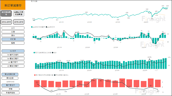 根據 FinSight 的觀察,出口指標以台灣資通訊與台灣電子零組件合併使用較為有效,當合併的出口 YoY 大於 0 代表廠商的出貨正火熱,此時廠商的營收也同時拉高,但能否延續就必須觀察存貨與訂單的變化。