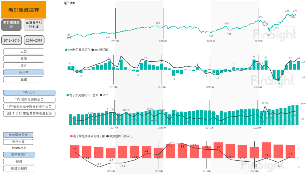 圖一、電子指數、PMI (新訂單減庫存)、台灣電子零組件與資通訊出口、台灣電子零組件存貨週轉天數