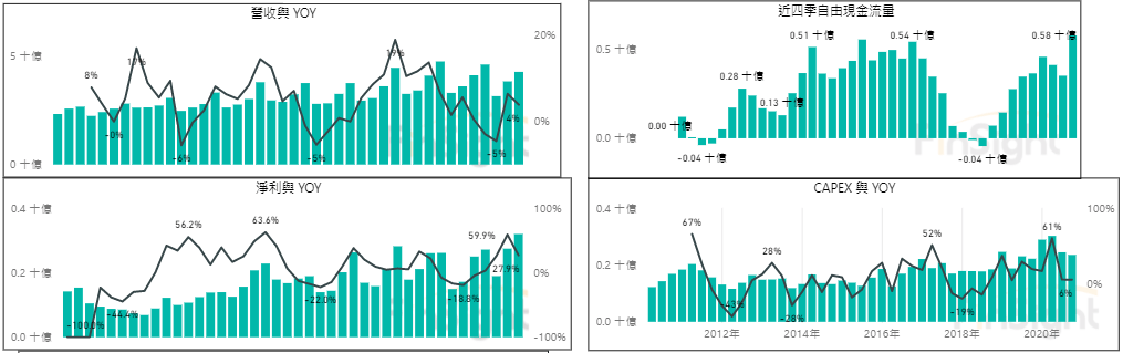 若統整整體的財報表現,可以發現台灣電子零組件的營收雖然只成長 4%,但獲利卻成長了 27%,獲利能力顯著優化之外,近四季自由現金流量也創歷史新高。
