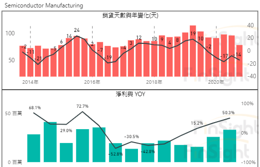 從庫存天數的變化值來看,下滑最多的是電子上游 IC 設計,庫存天數較去年同期下滑 14 天,且淨利大幅增加 50%。在缺貨的情況下,目前多數 IC 設計廠商仍可將價格轉嫁給客戶,唯一需要留意的是終端銷售與是否拿到足夠產能。