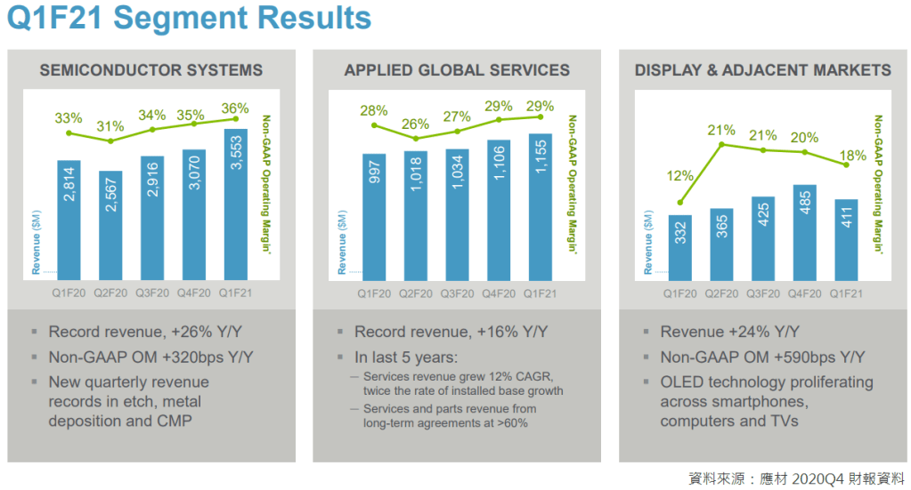 若以應材的業務來看,NAND 成長 34%、DRAM 成長 27%、Foundry 成長 23%,表現均優於整體市場平均。在上一季的強勁成長下,蝕刻、沉積、研磨業務都創新高。