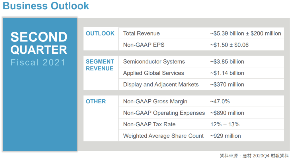 下季財測取中值預估成長 >50% YoY,會繼續優於整體產業成長。歸因於公司應用廣泛,客戶與產品多,加上新產品推出陸續獲得更多採用,去年成長最快的先進封裝領域也有最高的市占,預期 2021 年動能持續,新領域 Integrated Materials Solutions (IMS) 產品,將貢獻營收同時擴張市占;成熟製程設備需求也好 ( IoT / 通訊 / 車用 / Power and Sensor ) 預期 FY21 可貢獻 3B 美元營收。