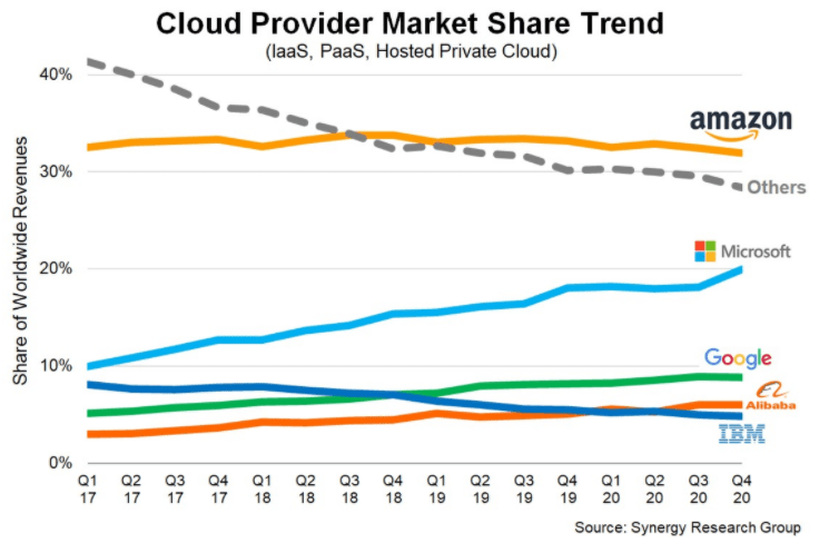 - 微軟市佔持續大幅提升,是企業轉雲的最大受惠者:2020Q4 亞馬遜和微軟全球市占達一半以上,微軟佔比從 2020Q3 的 18% 上升到 20%、過去 16 個季度中市佔從 10% 快速成長到 20%。