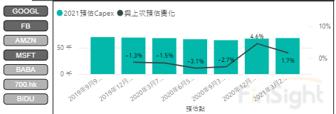 其中,MSFT 與 GOOG 將提升、FB 維持原先高支出水準、AMZN 在物流方面投資有不確定性,但資料中心投資維持健康。