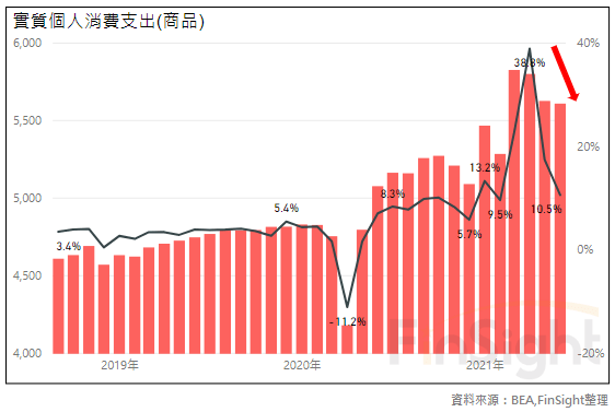 在今年三月,美國個人取得最後一輪 1400 美元補貼之後,可支配所得也在 3 月見到高點。同時拿到了現今也讓商品消費在 4 月跳升了一個台階,創下歷史新高。而現在,美國可支配所得逐步下滑,已呈現金額年衰退,民眾手中的現金流已經不像過去一年這麼寬裕。