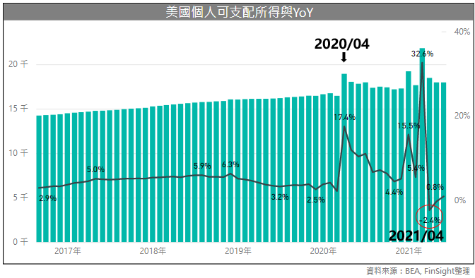去年美國開啟商品消費商機的關鍵,在於政府補貼。個人可支配所得於 2020/4 出現大幅增加,民眾手中現金變多又只能待在家裡,促使個人消費金額中的商品在 2020/6 創下歷史新高,且後續動能依舊居高不下直到今年上半年。