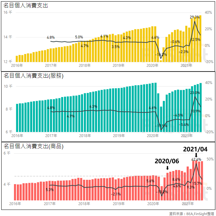 當時講到,由於美國可支配所得大幅提升,加上民眾在家時間變長,使得總體個人支出較前一年衰退的情況之下,大幅提升了「商品的購買」、同時減少了服務的支出,造成商品出現了近幾年來最強勁的需求,直到今年上半年為止仍持續大幅創新高。