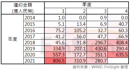 表二:中國信用債逐季違約金額(單位:億人民幣)