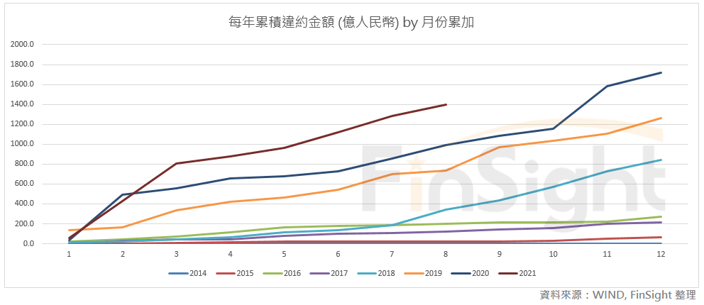 這兩年中國政府開始對房地產嚴格監管,從 2020 年三道紅線開始,不斷收緊對房地產企業的資產負債表要求,導致中國房地產企業不斷出現債務違約問題、陷入資金斷鏈的困境中。統計到八月底,中國房地產相關項目的違約金額早已創下歷史新高。